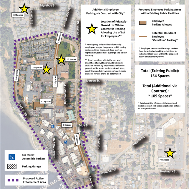 Designated employees will need to park in designated areas. Please see attached map as reference. Areas include: designated area in the King Olaf Parking Lot, 3rd Ave., Moe St., Jensen Way (north of Iverson St.), north side of Front Street (spaces located north of the King Olaf lot), and the Post Office. There is also additional parking at the Gateway Fellowship Park and Ride where there are buses that can take employees into Downtown: https://www.kitsaptransit.com/service/routed-buses. The City is also actively seeking additional employee parking spaces.